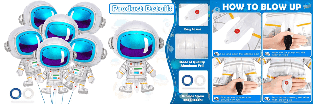 Istnieją wspólne kształty całego ciała astronautów, przedstawiające astronautów w skafandrze kosmicznym, niektóre style z podstawą, nadmuchiwane mogą stać. Dostępne są różne rozmiary, takie jak 18 cali, 24 cale, 28 cali itp., A także niektóre większe balony, takie jak stojące balony foliowe astronautów o wysokości 65 cm. Wykorzystywany jest głównie do przyjęć urodzinowych o tematyce kosmicznej, przyjęć powitalnych dla dzieci, dekoracji pokoju dziecięcego i innych okazji, które mogą dodać radosnej kosmicznej atmosfery do wydarzenia.