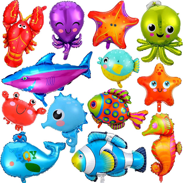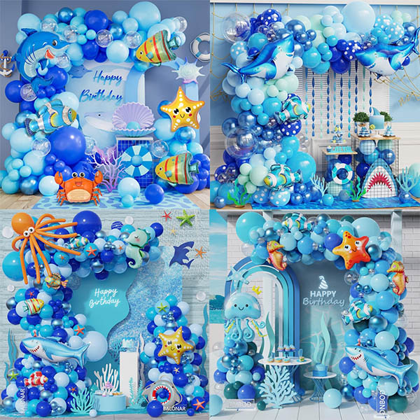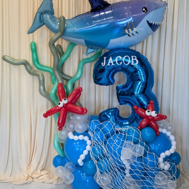 2. Folia balon:Balloon Garland z balonami z folii rekinów, ten pakiet jest wyposażony w balony foliowe z różnymi kreskówkowymi stworzeniami morskimi, takimi jak rekiny, rozgwiazda, meduzy i morskie. Ponadto możemy również zaprojektować niestandardowe balony folii według twojego wzoru, aby stworzyć unikalny balon girlandy z balonami z folii rekinów.