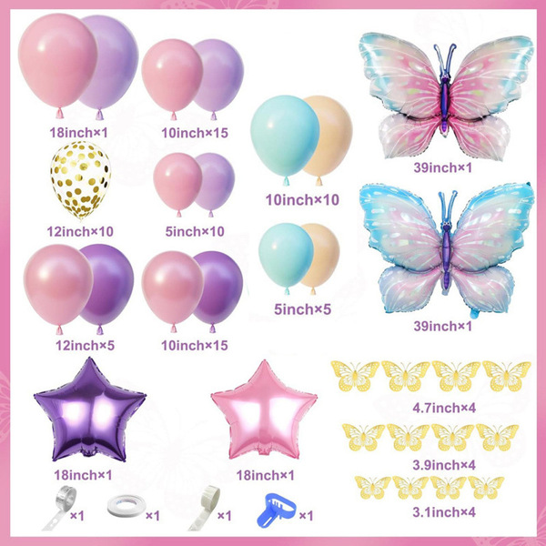 Zestaw girlandy z balonami w kształcie motyla zawiera głównie balony lateksowe, są dostępne w różnych rozmiarach (5 cali, 10 cali, 12 cali i 18 cali). W ich kolorystyce dominują najczęściej róż, błękit, fiolet itp. Aby wzmocnić efekt warstwowy zestawu, można zobaczyć także balony lateksowe przezroczyste i lateksowe konfetti. Jako motyw przewodni zestawu nieodzowne są także balony foliowe w kształcie motylków. Większość ich kolorów jest jasna (niebieski/różowy/fioletowy...), a średni rozmiar to 18-30 cali (z dostępnymi rozmiarami niestandardowymi). Ponadto mają bardzo realistyczny wygląd, który jest prawie realistyczny.