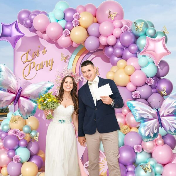 Zestaw łuku z balonu motylkowego: Zestaw łuku jest kolorowy i przyciąga wzrok, składa się z różnych balonów foliowych i balonów lateksowych. Po ułożeniu dodaj planszę tła z wzorami i innym tekstem, a następnie otocz ją balonami. To on kreuje atmosferę wydarzenia. Robienie zdjęć przed nim będzie wyglądać bardzo pięknie.