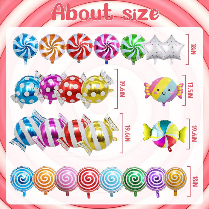 Balony z serii cukierków są obecnie dostępne w różnych kolorach i stylach, tworząc nową dekorację imprezową o tematyce cukierki dla dorosłych, dzieci, chłopców, dziewcząt i ludzi w każdym wieku. Jasne i kolorowe balony świąteczne cukierki, uroczy garnitur z folii imprezowej o tematyce Lollipop jest uroczym dodatkiem do twojej dekoracji przyjęcia o tematyce urodzinowej. Candy Foil Balloon idealnie pasuje do innych dekoracji na imprezę cukierków, tworząc piękny prezent, tło i rekwizyty dla przyjaciół, którzy lubią Lollipops.