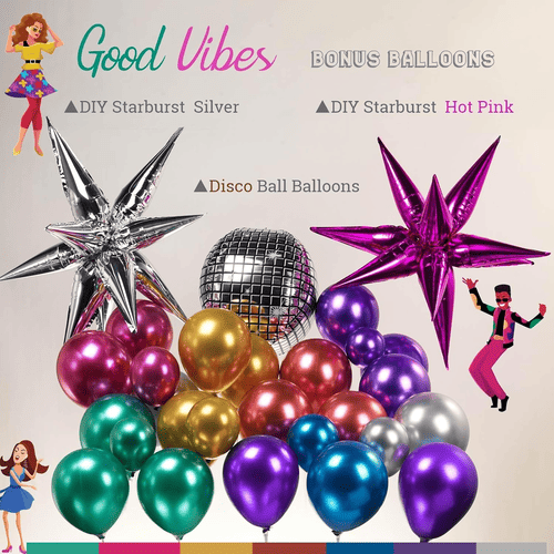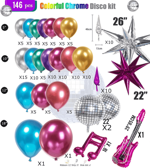 Thezestaw w kształcie łuku balonowego discoskłada się głównie zkolorowe balony lateksowe Iróżne balony foliowe. Aby uzyskać błyszczący chromowany styl, dostarczane przez nas balony lateksowe to metaliczny balon lateksowy, ich powierzchnie mają bardzo piękny metaliczny połysk i mogą osiągać doskonałe rezultaty zarówno wewnątrz, jak i na zewnątrz. Ich rozmiary to 5 cali, 10 cali, 12 cali i 18 cali.