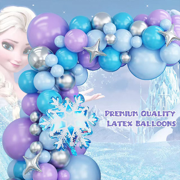 Zamrożone imprezowe dekoracje balonowe girland zestaw czerpią inspirację z popularnego mrożonego adresu IP. Dokładnie odtwarza kolory z filmu. Łączy fajne kolory, takie jak niebieski, srebrny, fioletowy i biały. Niebieski jest jak wczesny poranny niebo Arendelle. Lekki fiolet jest jak blask załamany przez magiczne kryształy lodu. Srebrne dekoracje są jak odbicie płatków śniegu. Budują system kolorów z bogatymi warstwami. Tworzą marzycielskie i eleganckie wrażenia wizualne.