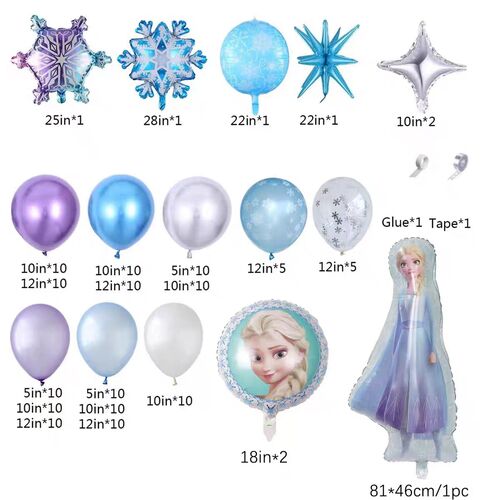 Balony foliowe stanowią główną część zestawu łuków balonowych z motywem Krainy Lodu. Należą do nich głównie balon foliowy z portretem głowy księżniczki, balon foliowy w kształcie bałwana. Można również dodać balon foliowy z cyframi i balon foliowy z literami, aby stworzyć wyższą atmosferę imprezy, tak jakbyś chciał dekoracje w stylu przyjęcia urodzinowego.