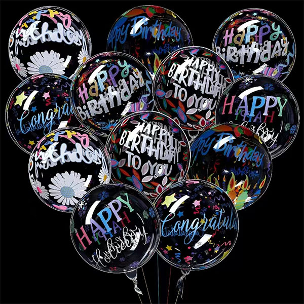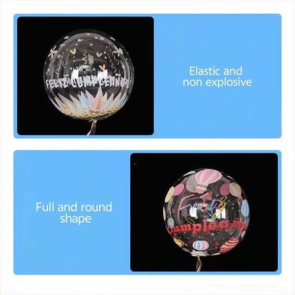 Wydrukowany balon z okazji urodzin Bobo ma słowa „Wszystkiego najlepszego” i niektóre projekty wydrukowane na powierzchni balonu. Nadruk jest wyraźny i jasny. Kolor nie zanika. Główną cechą projektu jest jednoczęściowa forma. Słowa i projekty są częścią balonu. Wygląd jest bardziej dobry i bardziej profesjonalny. Wydrukowany typ ma wiele kolorów i wiele wzorów. Są to gwiazdy, korony, nuty i inne kształty. Wykazują głębokość i warstwy na czystej powierzchni balonu. Balon wygląda bardziej wysokiej klasy i bardziej elegancko. To jest dobre do dekoracji imprezy.