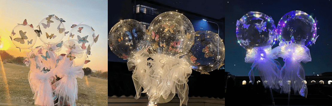 Balon Bobo sam w sobie jest przezroczysty i prosty, co jest w dużym stopniu zgodne z elastycznością przepuszczania światła pustej naklejki w kształcie motyla. Podstawowym zastosowaniem naklejki jest przekształcenie monotonnego balonu w zawieszoną kulę do tańca motyla i sprawienie, że balon stanie się centrum sceny dzięki trójwymiarowemu kształtowi motyla oraz efektowi światła i cienia. Przyjęcie urodzinowe dla dzieci, przyjęcie urodzinowe dla dorosłych, strefa powitalna weselna, zajęcia w centrum handlowym, dekoracja domu wakacyjnego są bardzo odpowiednie. W nocy można go również dopasować do świateł LED, co bardzo przyciąga wzrok.