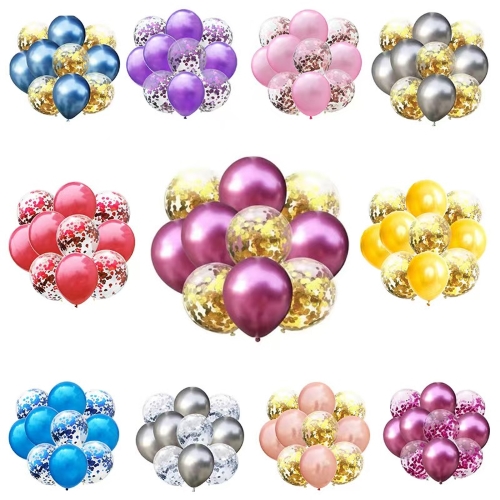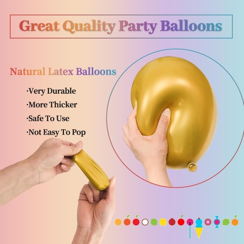 Możesz wybrać jeden kolor metaliczny dla pakietu. Popularne opcje to szampańskie złoto, metaliczna zieleń, różowe złoto i tak dalej. Dzięki temu Twoja scena wydaje się prosta i uporządkowana. Rozciąga się naprawdę dobrze. Prawie nigdy nie wyskakuje. Po nadmuchaniu pozostaje pełny przez ponad 12 godzin. Można także mieszać różne odcienie metaliczne. Wypróbuj złoto i srebro razem. Tworzy to warstwowy, przyciągający wzrok wystrój. Połącz te balony również z lateksowymi balonami konfetti. Gładki połysk metalicznych balonów kontrastuje z błyszczącą fakturą konfetti. Konfetti porusza się w środku, gdy je potrząśniesz. To dodaje zabawy i ruchu do każdej przestrzeni. Małe zestawy balonów w kolorze metalicznym sprawdzają się na przyjęciach urodzinowych, weselach, imprezach świątecznych i wystawach sklepowych. Każdy zestaw przechodzi rygorystyczne testy szczelności i bezpieczeństwa. Spełnia międzynarodowe standardy, takie jak EN71 i CE. Napompowanie ich jest łatwe. Mogą z nich korzystać nawet nowicjusze zajmujący się majsterkowaniem. Uwielbiają je także profesjonalni planiści wydarzeń. Stworzysz przestrzeń z niesamowitą atmosferą.