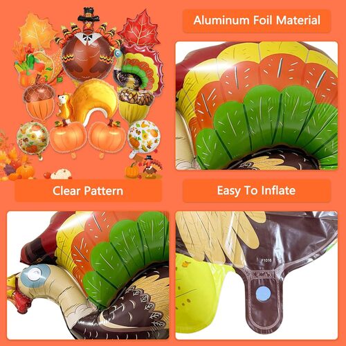 - Inne stylizowane balony foliowe (okrągłe balony foliowe na Święto Dziękczynienia i balony foliowe z literami na Święto Dziękczynienia) są dostępne w różnych rozmiarach