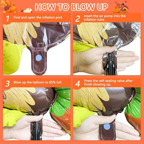 Balony foliowe na Święto Dziękczynienia będą bardzo łatwe do nadmuchania i zapieczętowania. Do nadmuchania możesz użyć pompki ręcznej lub elektrycznej, a następnie zakleić ją klejem samoprzylepnym, który znajduje się na końcówce każdego balonu. Po zamknięciu balon stanie się mocny.