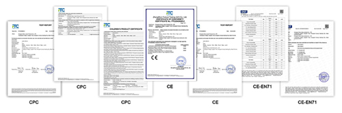 Nasza pełna gama produktów przeszła certyfikaty CPC, CE, EN71 i inne autorytatywne certyfikaty, w ścisłej zgodności z europejskimi i amerykańskimi oraz innymi przepisami bezpieczeństwa rynku docelowego. Kwalifikacje te mogą pomóc Twoim towarom w sprawnej odprawie celnej i całkowitym uniknięciu ryzyka związanego z przestrzeganiem przepisów na rynkach zagranicznych.