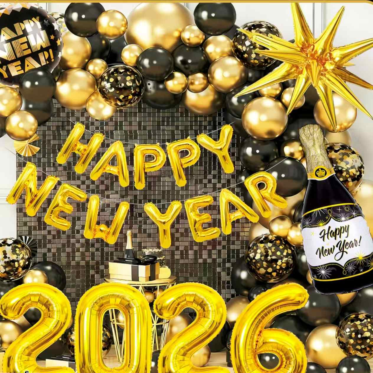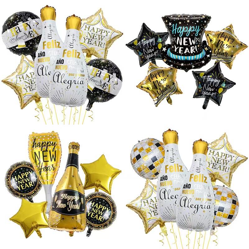 Pomyśl o zestawie z motywem noworocznym. Zawiera balony foliowe, które wyglądem przypominają butelki szampana. Zawiera także balony z cyframi „2026”, balony dekoracyjne w kształcie gwiazdek i wiele innych. Główne kolory to czarno-złoty lub złoto-biały. Jest pełen świątecznej radości Nowego Roku. Z łatwością może stworzyć luksusową i uroczystą scenę imprezy sylwestrowej.