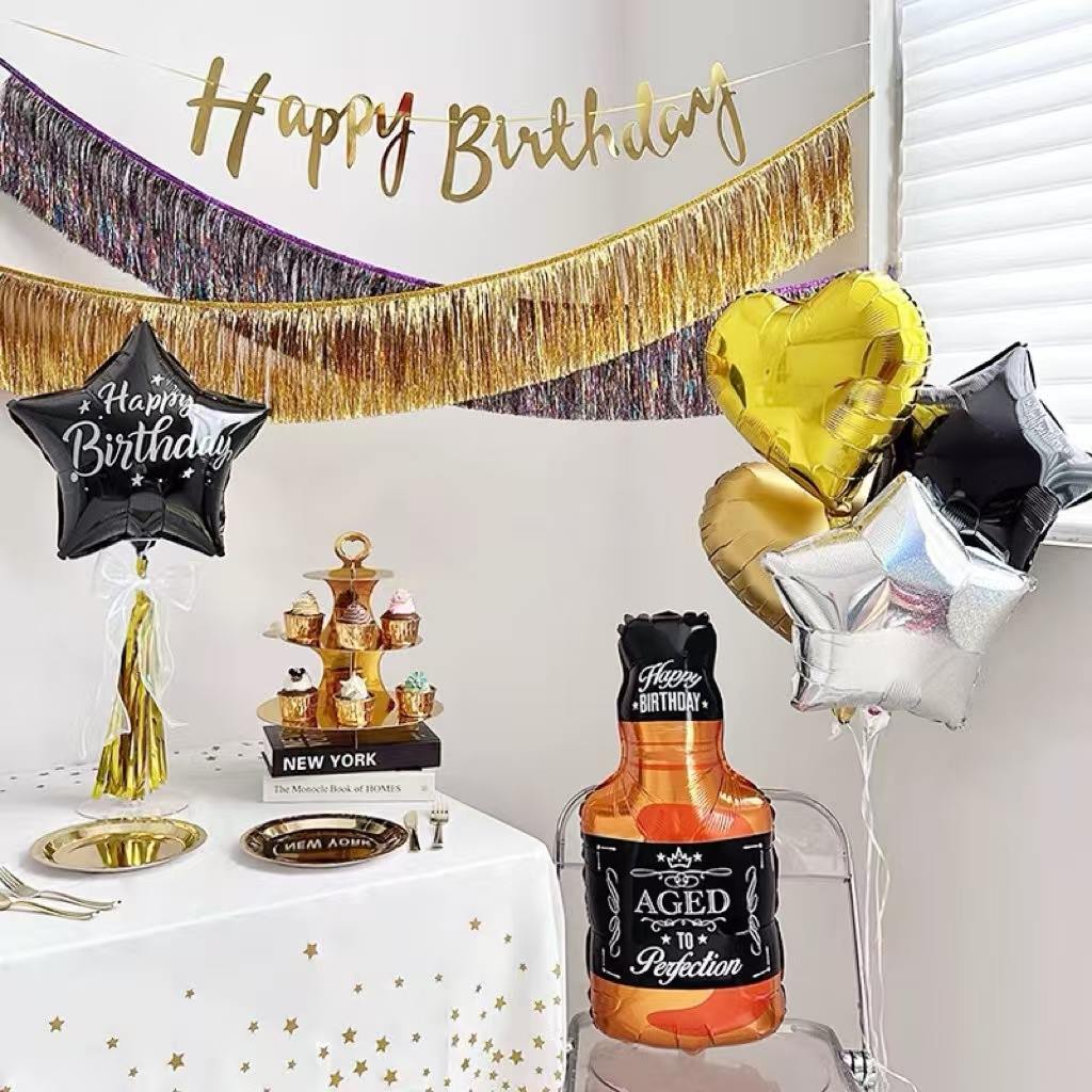 Jest też zestaw z motywem urodzinowym. Różowe i urocze balony na butelki wina zostały zaprojektowane z balonów foliowych w kształcie serca i balonów z napisem „Happy Birthday”, a kolor różowego złota jest bardzo romantyczny i ciepły. Dodaje słodkiego charakteru przyjęciu urodzinowym.